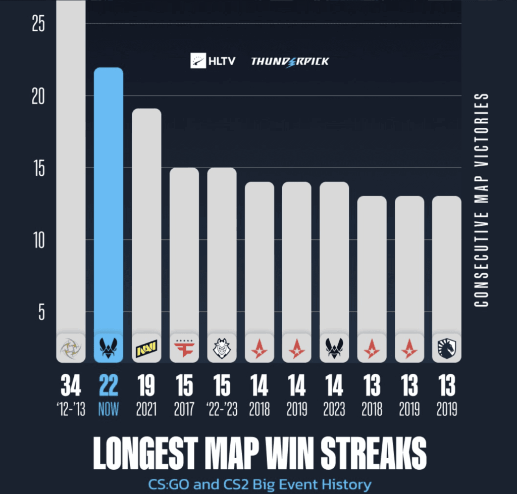 Verta paminėti, kad „Vitality” turi 22 iš eilės laimėtų žemėlapių seriją, o tai yra antras visų laikų rezultatas, vertinant „CS2” ir „CS:GO” disciplinas. Prancūzų organizacijos rezultatas nusileidžia tik „NIP” komandos rezultatui, kurį pasiekė 2012-2013 metais, kai komandai pavyko laimėti 34 žemėlapius iš eilės. Tačiau vertinant dabartinę „Vitality” formą, komandos susižaidimą ir potencialą, šis daugiau negu 10 metų nepajudinamas rekordas gali būti pranoktas.